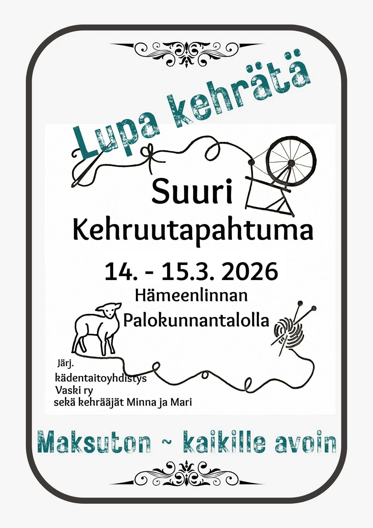 Tule juuri sellaisena kuin olet, omana itsenäsi. Tapaa tuttuja, sovi tärskyjä, tutustu toisiin lajiin hurahtaneisiin, löydä uusia näkökulmia, opi ja opeta, hihitä ja höpsöttele. Ja tietenkin kehrää.